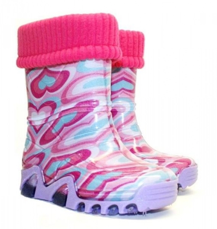 Покупали, как первые резиновые сапоги, на дождливую погоду. У нас именно такие, как на картинке с сердечками, очень красивый дизайн, теплая вкладка тоже радует, никогда не протекали, ножке всегда сухо и комфортно. Деть наверное все лужи в них измерял и они прошли контроль на УРА! Минус этих сапогов это вес, очень тяжелые, как для ребенка малых лет жизни. Плюсы: Цена, качество, дизайн. Минусы: Вес. | |