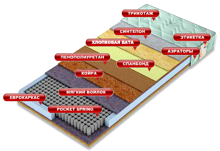 Койра придает матрацу дополнительную жесткость и упругость. Этот натуральный материал является гипоаллергенным, не поддается деформации, хорошо вентилируется в летнее время года и сохраняет свою эластичность на протяжении многих лет. Между пружинным блоком и койрой расположен мягкий войлок.