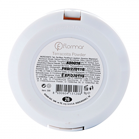 Пудра Flormar Terracotta нового поколения обеспечивает мягкое, шелковистое нанесение. Обладает прекрасной покрывающей способностью, создает идеальный макияж. Специальные смягчающие компоненты создают мягкую гладкую структуру. Превосходный комплекс масел, включающих в себя масла Макадамия, жожоба, а также витамины А, Е, F и омега-6, омега-7, омега-9 кислоты, ухаживают за кожей. Легко и быстро проникает в кожу, увлажняя ее. Натуральное масло жожоба выступает в роли прекрасного увлажняющего агента, масло макадамия прекрасно подходит для сухой кожи, нуждающейся в дополнительном уходе и увлажнении.