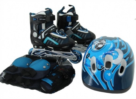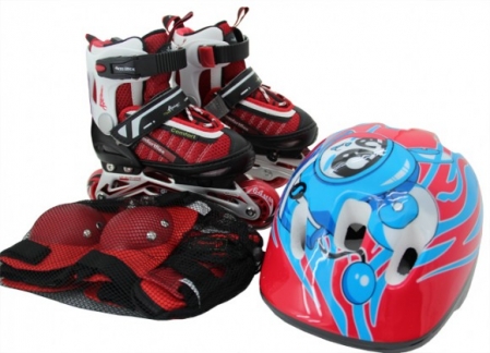 Комплектация: роликовые коньки, защитный шлем, наколенники, налокотники, зашита на запястье.