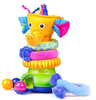 Игрушка с музыкой, различными звуками и световыми эффектами. На пластмассовую конусную основу пирамидки малыш надевает 4 мягких кольца, отличающиеся по диаметру, цвету и фактуре ткани. 2 кольца сплошные, а 2 других можно разомкнуть за счет липучки, - это "ручки и ножки" слона. Затем малыш надевает голову слона и пирамидка собрана. Получился очень милый слоник с мохнатым чубчиком и разноцветными шуршащими ушами. В комплекте 4 разноцветных пластмассовых гремящих мячика, которые малыш попеременно бросает в конус пирамидки. Как только мячик касается дна, ребенок слышит один из 4-х звуков (детский смех, овацию, хлопки и др.), затем играет одна из 4-х мелодий, пирамидка загорается и шарик выкатывается из дверцы пирамидки. Можно снова начинать игру. Возраст: от 6 месяцев.