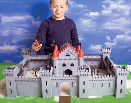 Рыцарский замок площадью 70х48 см имеет высокие крепостные стены с 6 башнями, по центру замка располагается штаб (дом с крышей, дверями и окнами) с флагами. Есть 4 лестницы для штурма стен замка. И, конечно, рыцари: всего есть 16 фигурок воинов. А также 4 коня — верных помощника рыцарей. 2 коня темно-коричневых, 2 – светло-рыжих. Некоторых рыцарей можно сажать на коней.