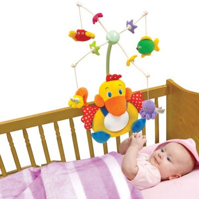 Под приятную мелодию игрушки медленно вращаются, и у детей развивается зоровое восприятие, происходит первое знакомство с цветом и формой.