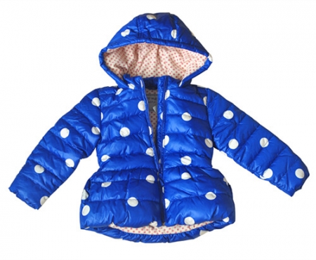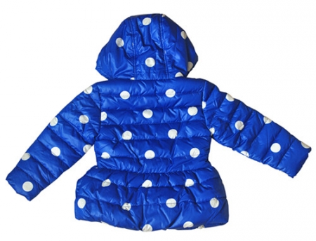 Кобальтовая водонепроницаемая дутая куртка в горошек. Капюшон, флисовая подкладка и молния по центру спереди.